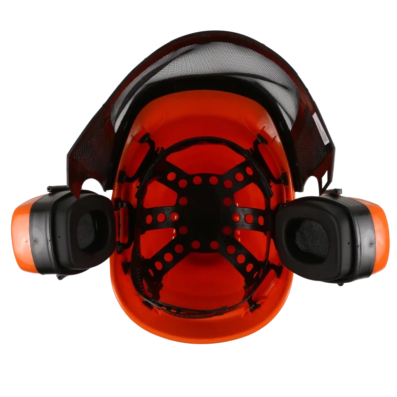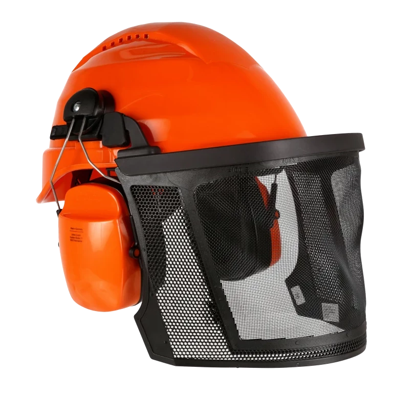 Combinaison forestière composée d'un casque léger en PEHD avec protections auditives assorties et d'une visière en maille de nylon sur un support en plastique.